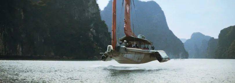 《AI创世者》剧照:一艘由仿生人控制的驳船穿越大海,抵达新亚洲大陆的一个港口。