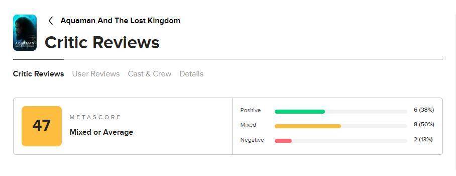 搜狐娱乐讯 温子仁执导DC超级英雄新片《海王2:失落的王国》海外口碑解禁,烂番茄网站新鲜度38%(18鲜29烂),Metacritic网站综评分47分(6优8良2差),口碑大扑街。