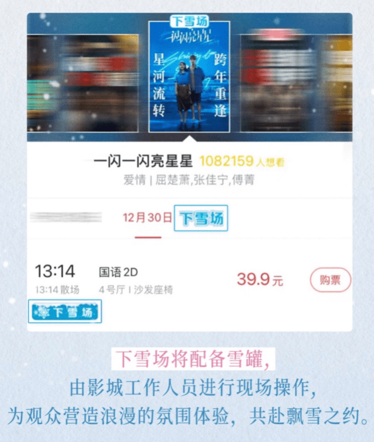 在社交平台搜索关键词,所有标注“下雪场”特别场次的排映早已销售一空,买到票的观众热切期待、整装待发,没买到的则一直守着售票平台等放票捡漏,可谓一票难求。尽管这些特殊场在《一闪一闪亮星星》超2.7亿票房的整体排映中占比并不算大,但形成的声量却显然已经为其转化了更多的观众与票房。