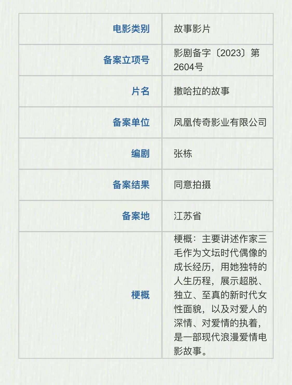 搜狐娱乐讯 据国家电影局2023年11月下全国电影剧本(梗概)备案、立项公示,故事影片《撒哈拉的故事》获准拍摄,编剧为张栋。