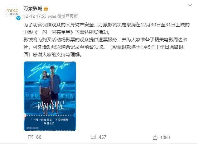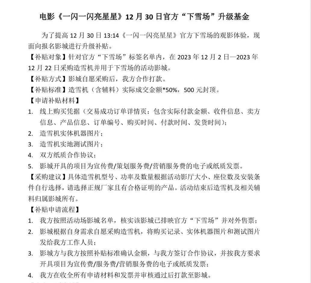 12月12日,万象影城官方微博发布了一则取消电影《一闪一闪亮星星》下雪特别场活动的公告。随后,便引发热议,记者电话询问了北京市万象影城(西三旗万象汇杜比巨幕店),确认影城没有“下雪场”的安排。
