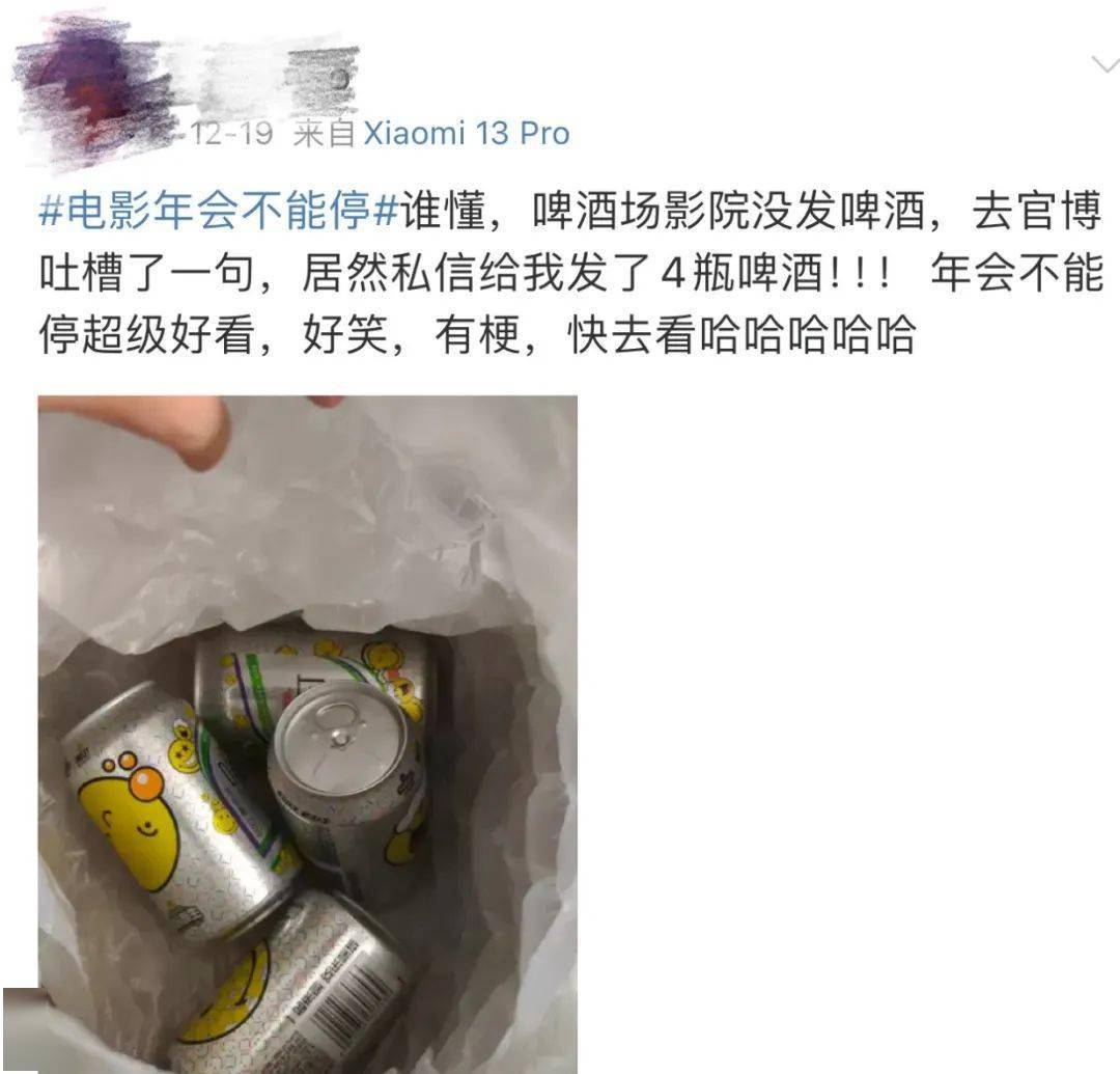 我们也随机在社交平台上搜索了《年会不能停》啤酒场的观众反馈,多数观众表示很喜欢这个观影礼物,“有人在电影院里就喝了”“和旁边观众干杯了”。但也有人@影城反馈,自己特意购买了特殊场但并未收到啤酒,评论中有不少回复表示:我也是,并吐槽活动组织存在疏漏。