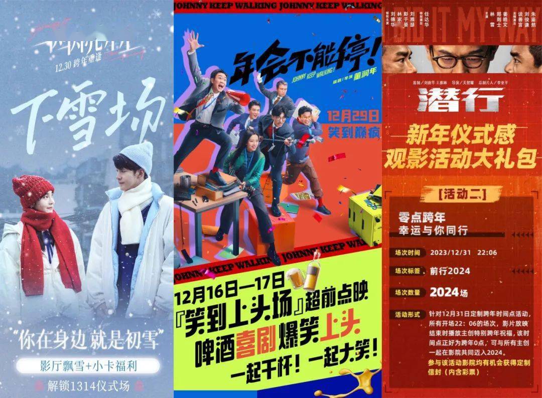 如今,整活也得“卷”起来,情绪营销对于离场感的追求直接从看戏“深度沉浸式”升级到戏外“交互体验式”。而继《一闪一闪亮星星》“下雪了”勇当“跨年档第一人”后,同档期各片方也立刻打不过就加入:《年会不能停》连推“啤酒场”“打工人场”猛打卖点,《潜行》则玩起了更直接的“彩票场”呼应影片的纸醉金迷。