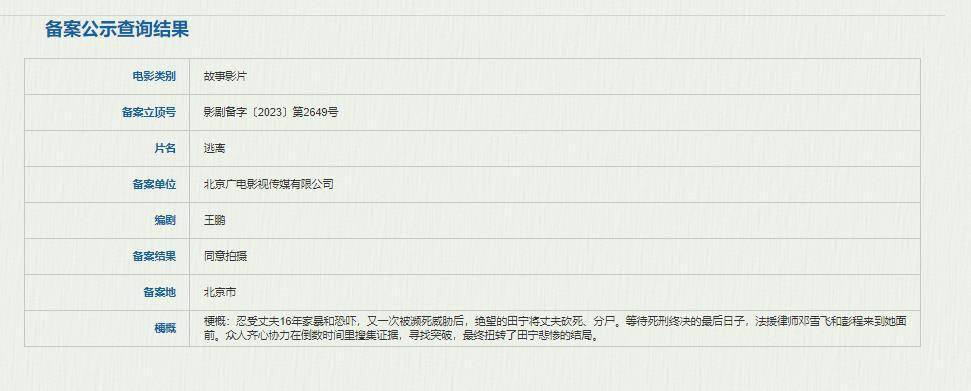 原标题:电影《逃离》立项 讲述被家暴妻子反杀丈夫的故事