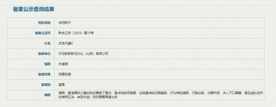 1905电影网讯 近日,国家电影局发布关于2023年11月下全国电影剧本(梗概)备案、立项公示的通知,电影《反贪风暴6》正式立项,编剧为林德禄,备案单位为天马影联影视文化(北京)有限公司。
