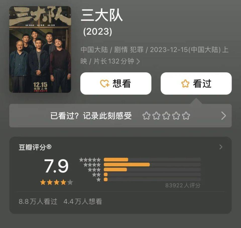 改编自网易人间小说《请转告局长,三大队任务完成了》的电影《三大队》,自12月15日上映以来,收获颇多关注,预售破亿,豆瓣开分7.8,后又上升到了7.9分,成为了年底评分最高的国产院线片,也成了张冀编剧生涯中,评分排名第二的作品,仅次于2014年8.4分的《亲爱的》。
