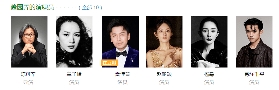 从目前的豆瓣演职员表中可以看到,章子怡、、赵丽颖、杨幂、以及等一线演员都将出演本片,这部电影《酱园弄》究竟有什么魅力?