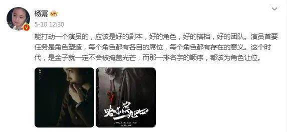 杨幂就曾发博回应关于《哈尔滨一九四四》的番位争议,“能打动一个演员的应该是好的剧本、好的角色、好的搭档、好的团队”,并表示“名字的顺序都该为角色让位”,拒绝番位比较。