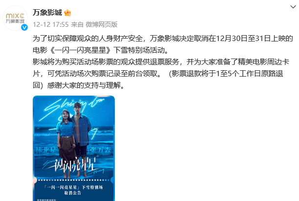 《一闪一闪亮星星》这段时间新闻不少,本来要做下雪特别场活动,但是为了切实保障观众的人身财产安全,万象影城决定取消在12月30日至31日上映的电影《一闪一闪亮星星》下雪特别场活动。你们觉得可惜吗?