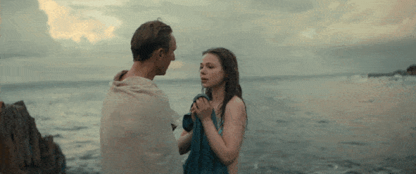 上岸后,湿漉漉的两人四目相对,擦出了异样的感情。