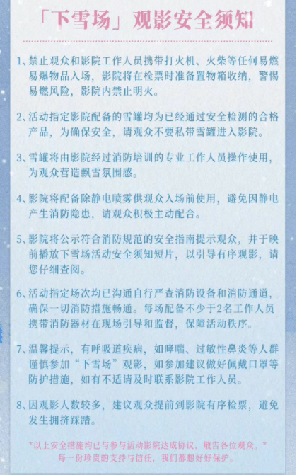 这些场次会在猫眼平台上,有特别标识认证。影院将配备雪罐,相关工作人员进行现场操作,为观众营造浪漫的氛围体验。当然,由于雪罐等器材的设置,官方也特别给出了禁止易燃易爆物品入场,影院配备的雪罐均通过安全检测,工作人员均经过消防培训等安全须知。