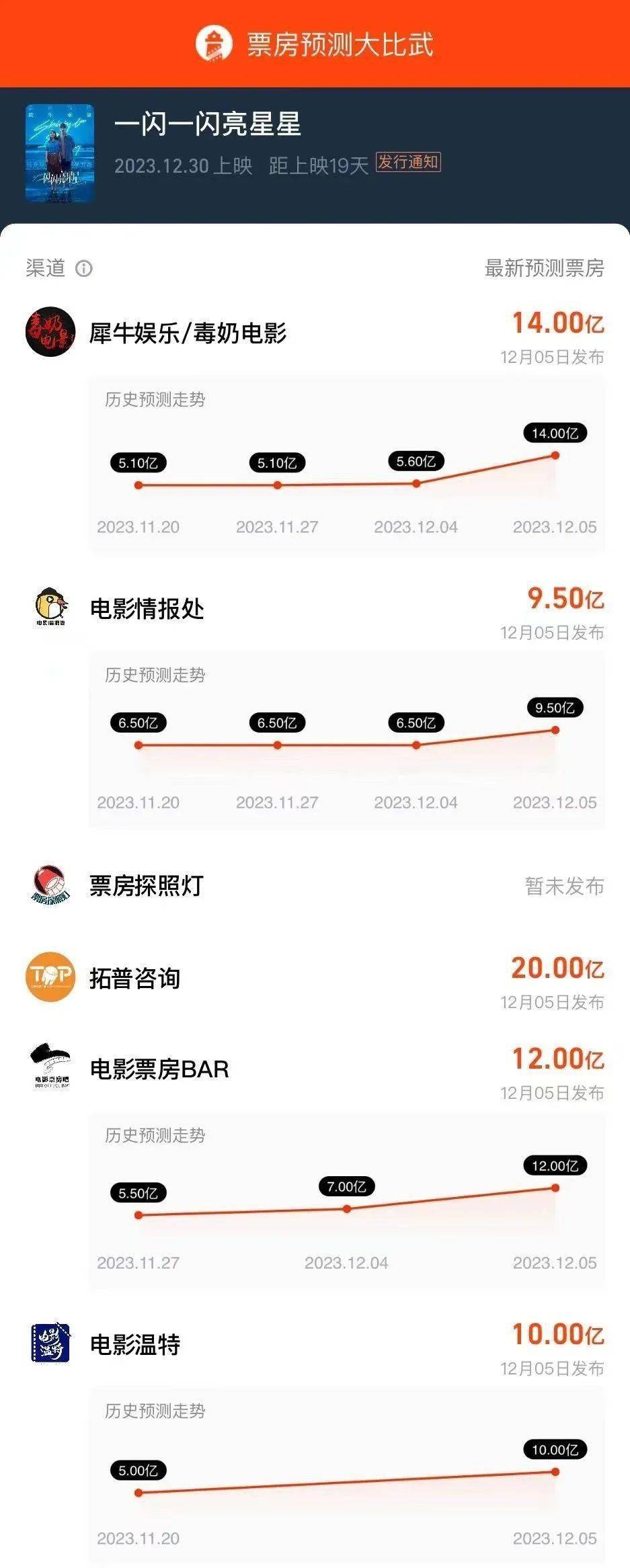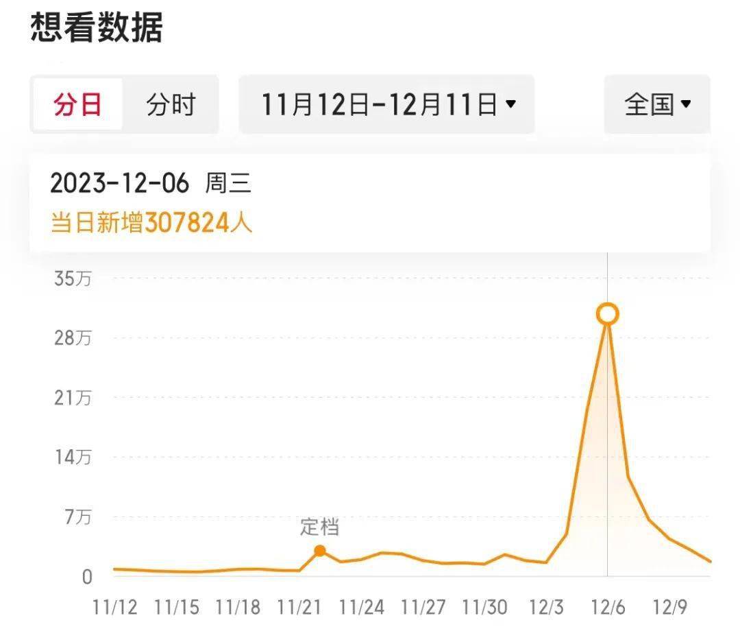 这一系列映前数据的增涨,成为了它被不断调高预测票房的关键。尤其是从平台数据显示,影片的“想看指数”在12月6日达到峰值,单日新增30万人。这天恰是预售开启次日,话题得到了各方充沛的发酵。