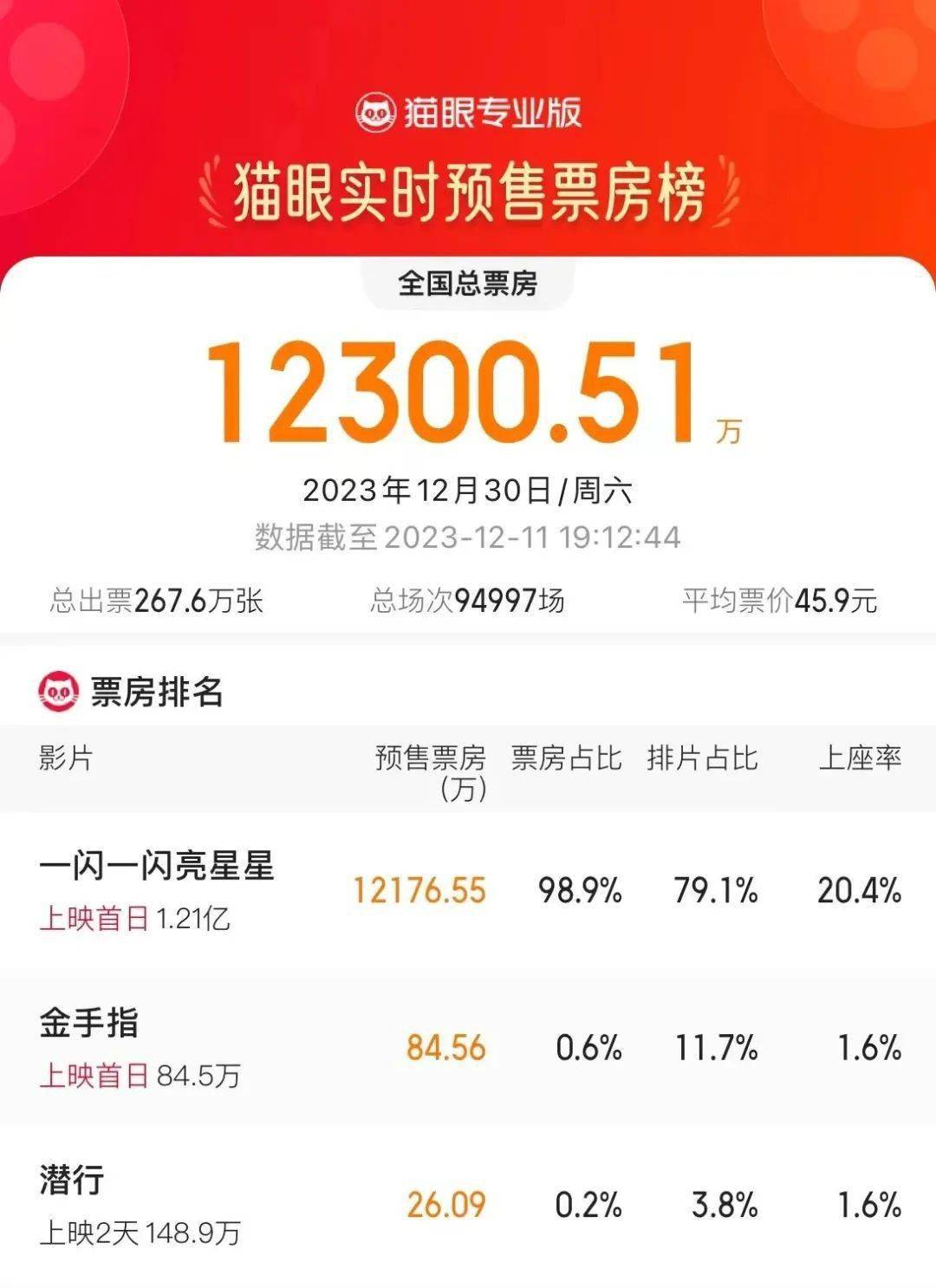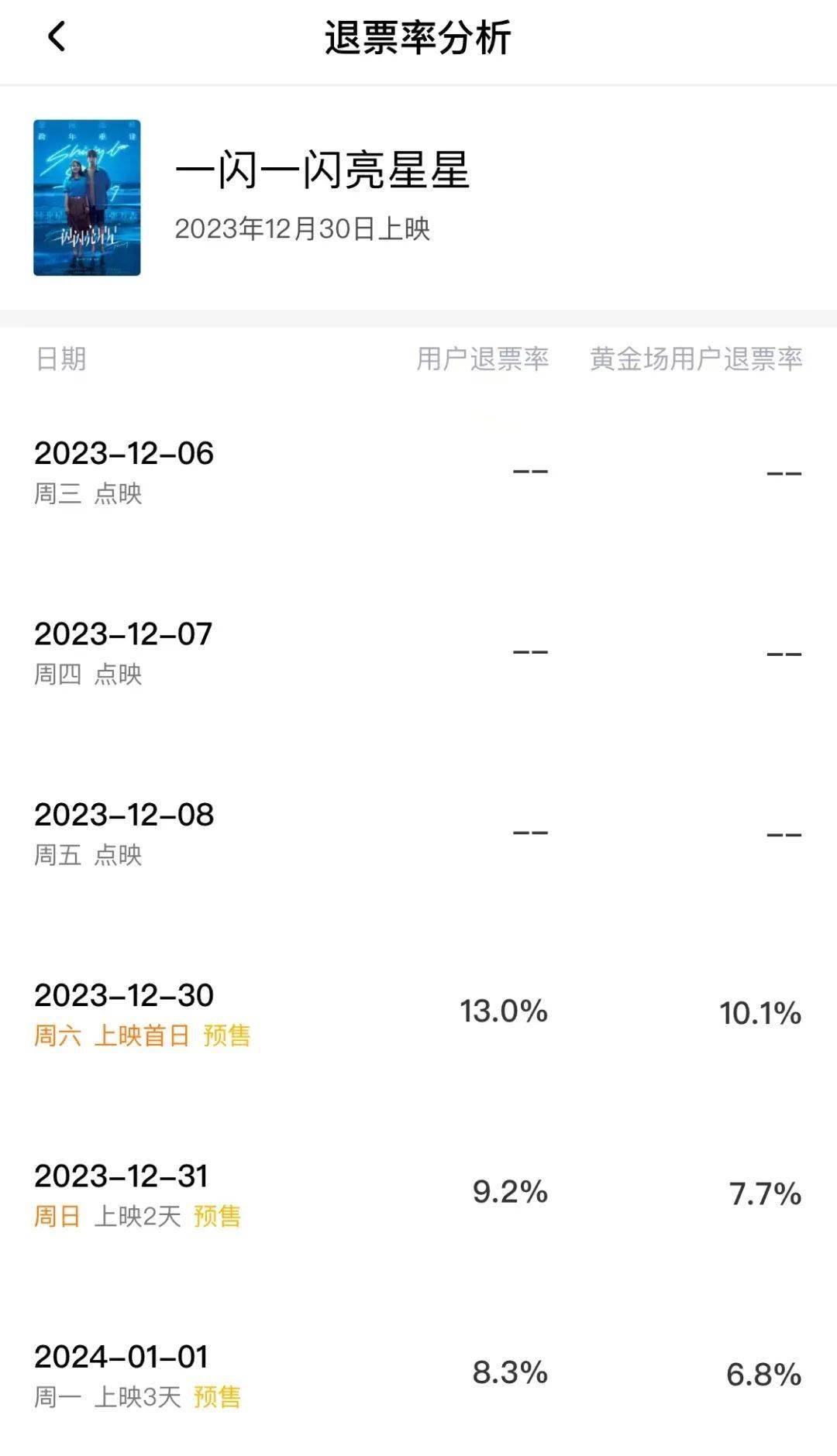 大家不禁好奇,影版《一闪一闪亮星星》到底为何如此“火热”,仅仅只是“下雪场”就能吸引这么多观众吗?但在高预售的同时,根据灯塔显示,12月30日退票率高达13%,其中黄金场的退票率高达10.1%,远超市场同期其他影片。