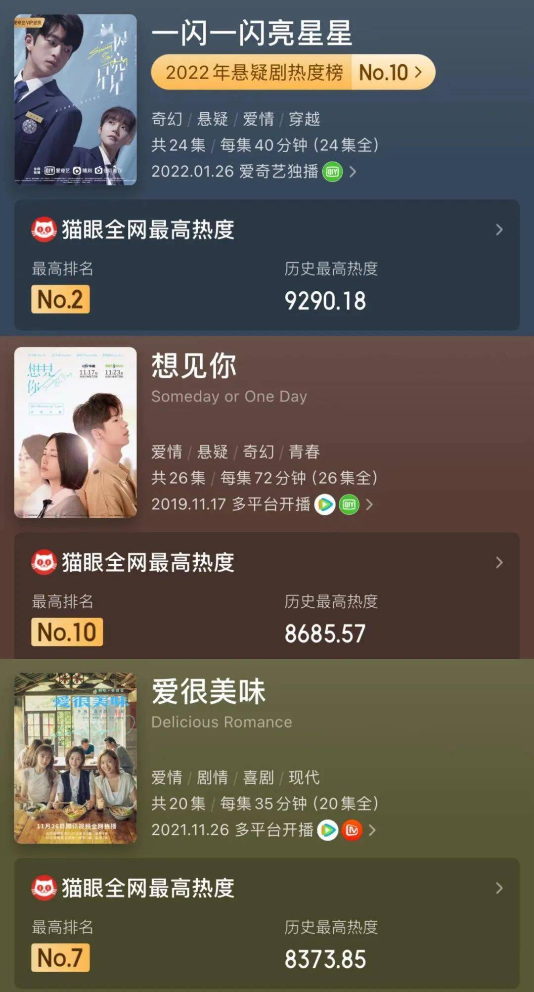 剧集以全集释出的方式上线,平台最高热度在6925。如果以猫眼专业版的全网最高热度作为唯一热度标准值,剧集《一闪一闪亮星星》的最高值在9290.18,《想见你》的最高值为8685.57,《爱很美味》则是8373.85。不过《想见你》播出时间在2019年年底,同时先于中国台湾地区播出,并得到口碑发酵,随后被大陆地区多个视频平台引进,相较之下,中间存有一定的热度折损。
