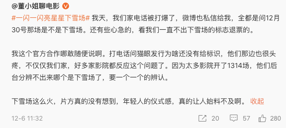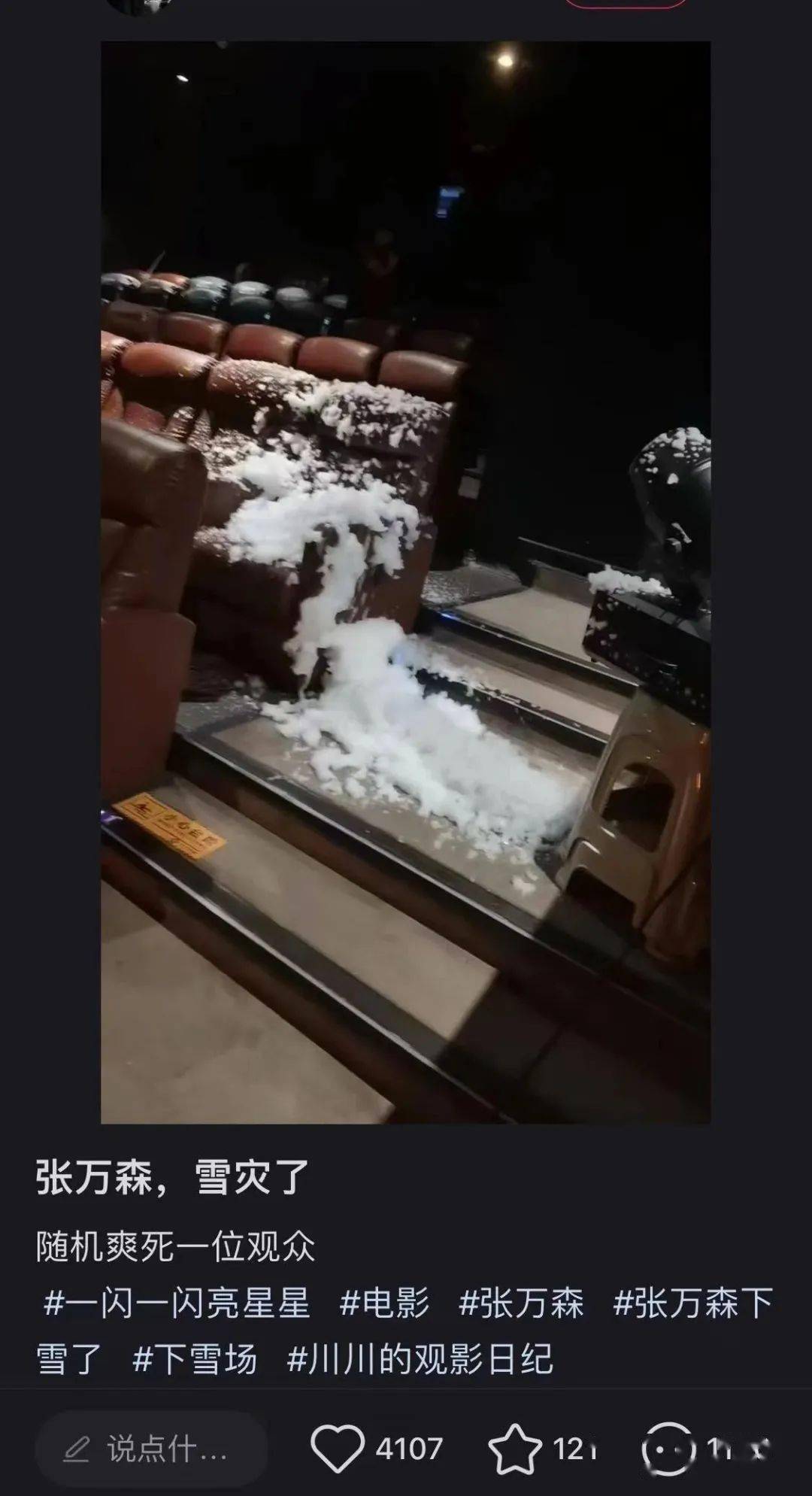 除了这1314场场次之外,不少没有合作的影院,甚至有开始自发购买相应设备,试图为观众送上特别的礼物。当然,这些影院也务必注意操作、消防安全等问题,切勿因操作不当而“翻车”。目前网上流传“翻车”事件,被调侃“张万森,雪崩了”。