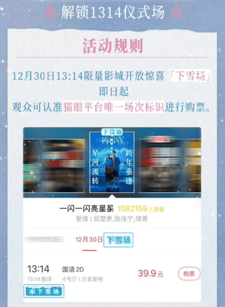 电影开启预售当天,发行方宣布推出“下雪场”,即2023年12月30日13:14的场次。事件一经宣布,不少影院率先推出排片,并很快得到了目标受众的购票支持,预售首日水涨船高的预售成绩,已经得到了很好的反馈。