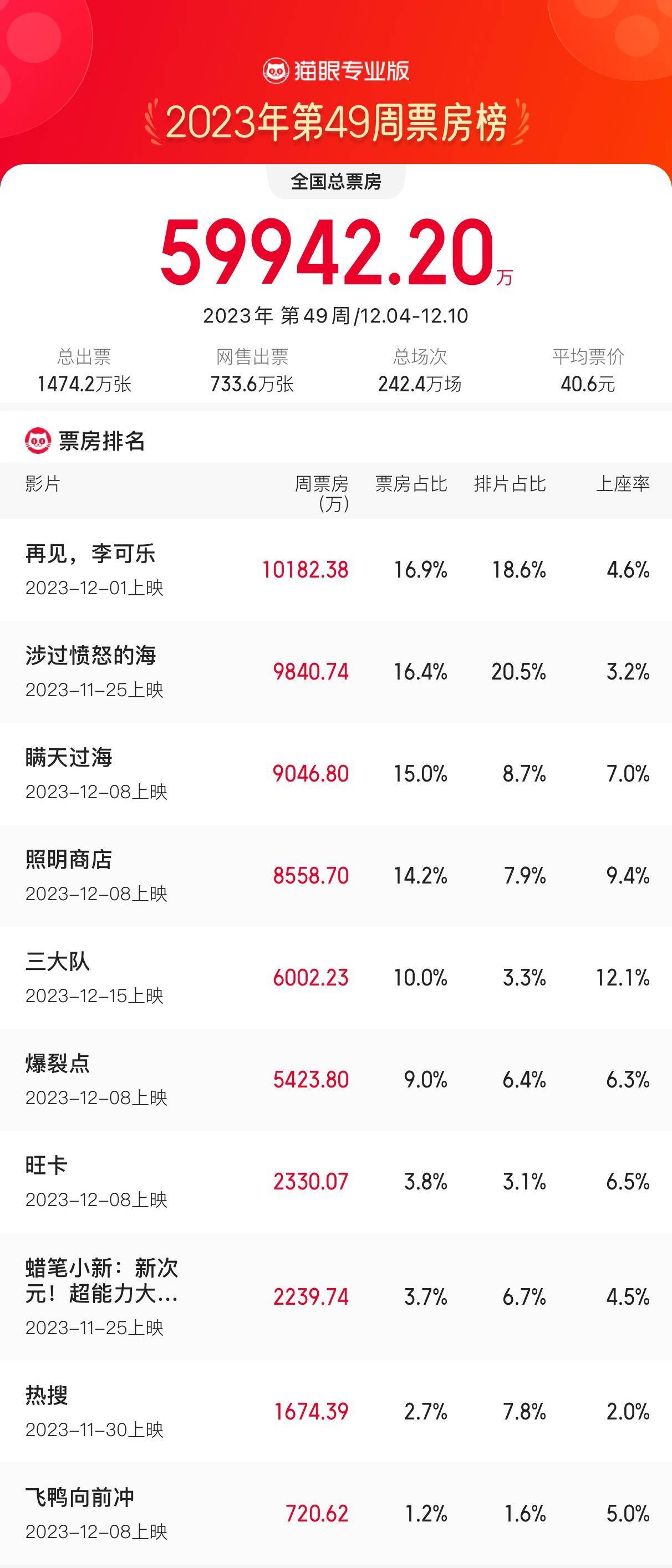原标题:12.4-12.10内地一周票房6亿《再见,李可乐》次周收1亿逆袭夺冠