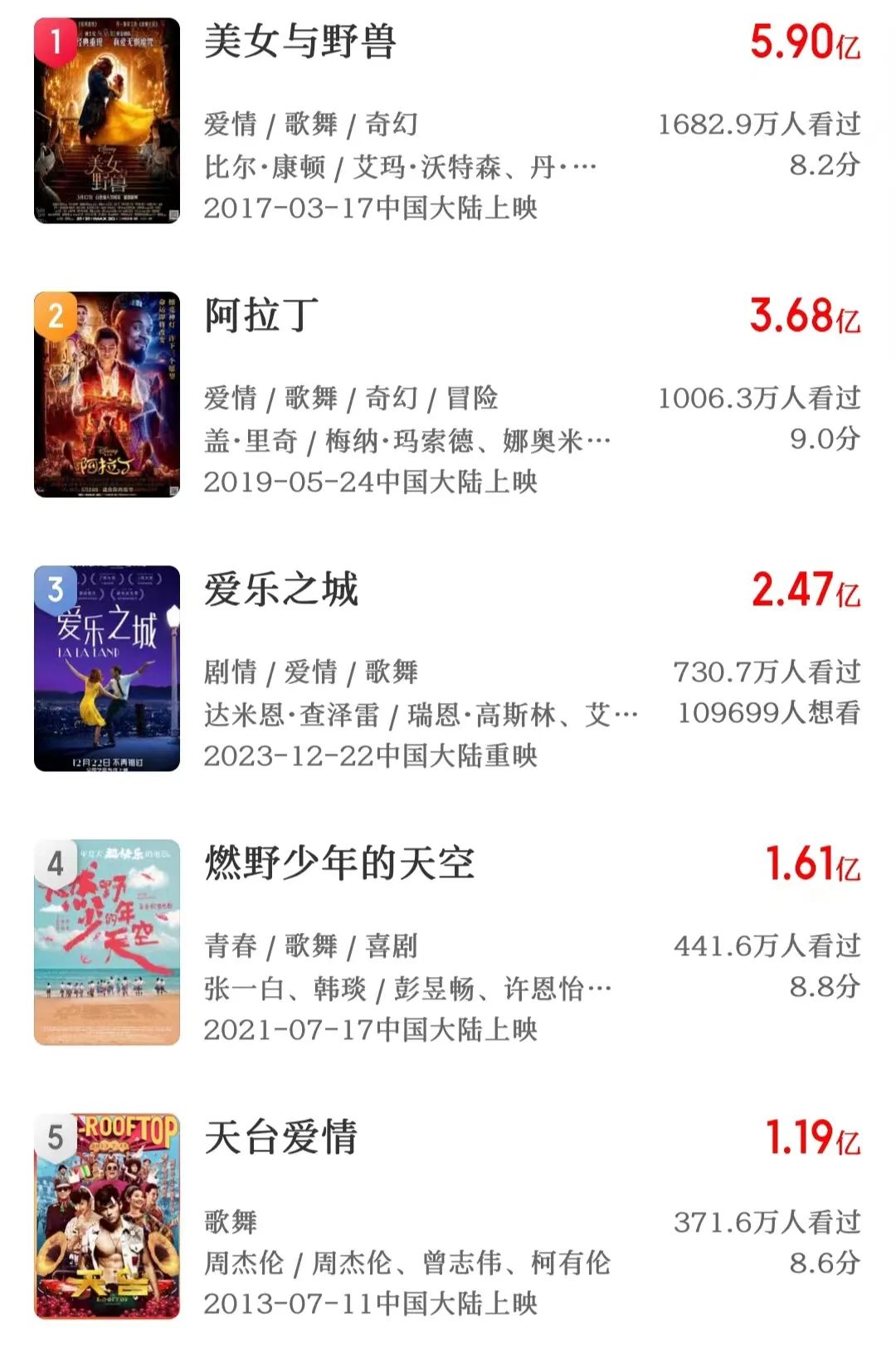 根据猫眼专业版的数据,内地歌舞片票房榜前三已经快有五年没有更新了,迪士尼成为最大霸主。在《燃野少年的天空》出来之前,《天台爱情》一直稳坐国产歌舞片票房榜首的位置,十年过去,依旧一个能打的都没有;2006年上映的电影《如果·爱》凭借3000万的票房也位于内地歌舞片票房榜前十之列,歌舞片这一类型在华语电影的发展中“断代”。