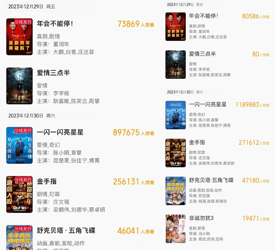 当然,也不排除会出现《一闪一闪亮星星》跨年夜之后票房跳水,而其他影片后来居上的情况,但对院线来说,一个是可见的收益,另一个是未知的赌博,怎么选一目了然。