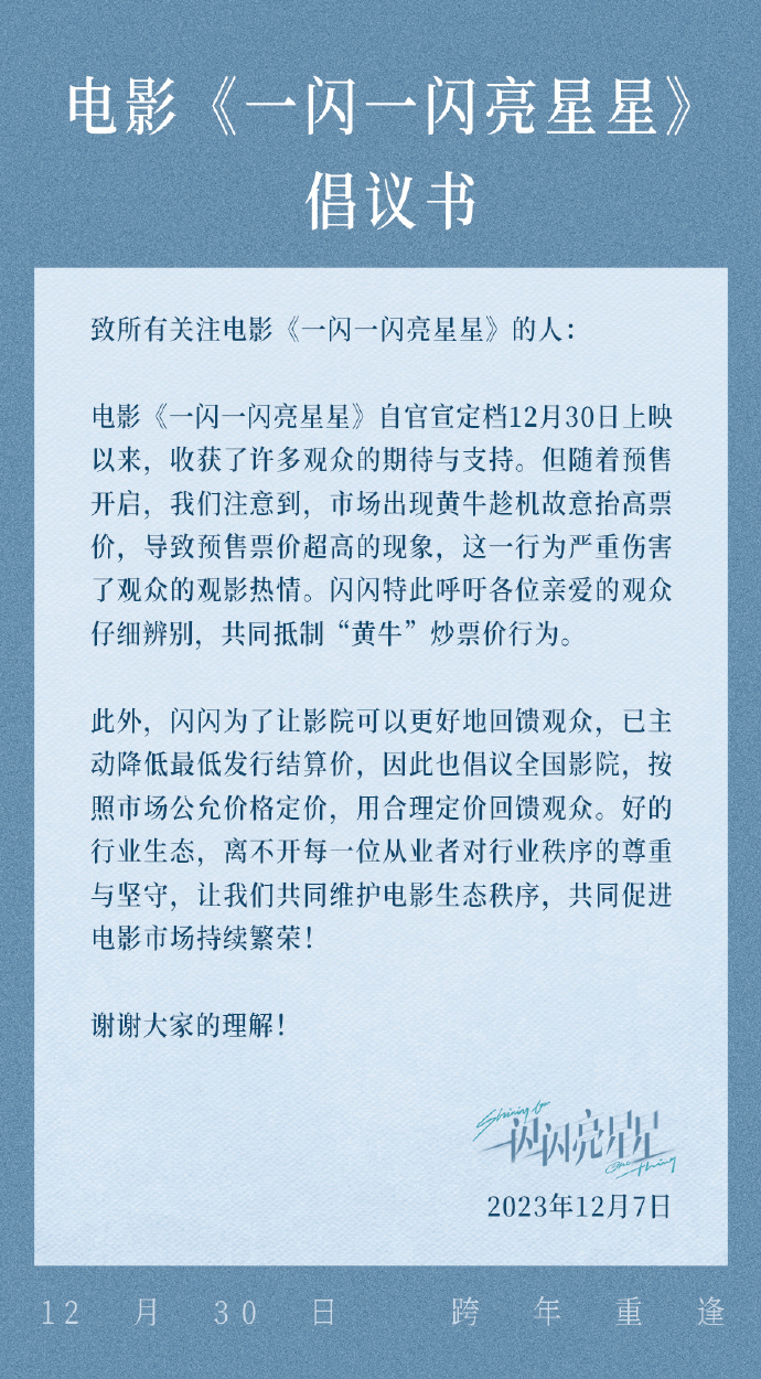 《一闪一闪亮星星》不采用分线发行应该已是既定事实。分线发行的基本特征是在部分院线上映,而片方发表的一封电影票价倡议书中写的是“倡议全国影院”而非“合作院线”。