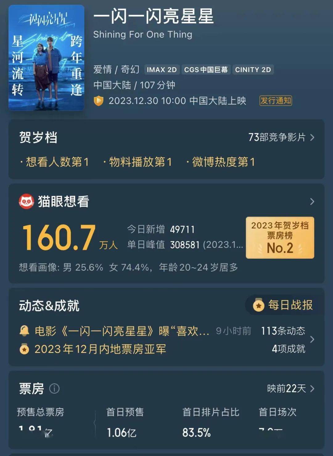 离正式上映还有二十多天,电影《一闪一闪亮星星》预售票房已突破1.8亿人民币。虽说在内地影市,爱情片总能在特殊节日时突围,但这个成绩还是让人惊掉了下巴。