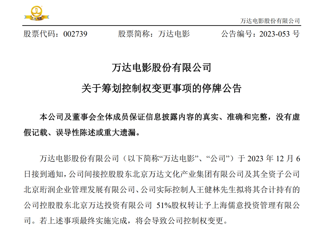 12月6日,万达电影发布公告称,公司实控人王健林及相关公司,拟将其合计持有的公司控股股东万达投资51%的股权转让给上海儒意投资管理有限公司。