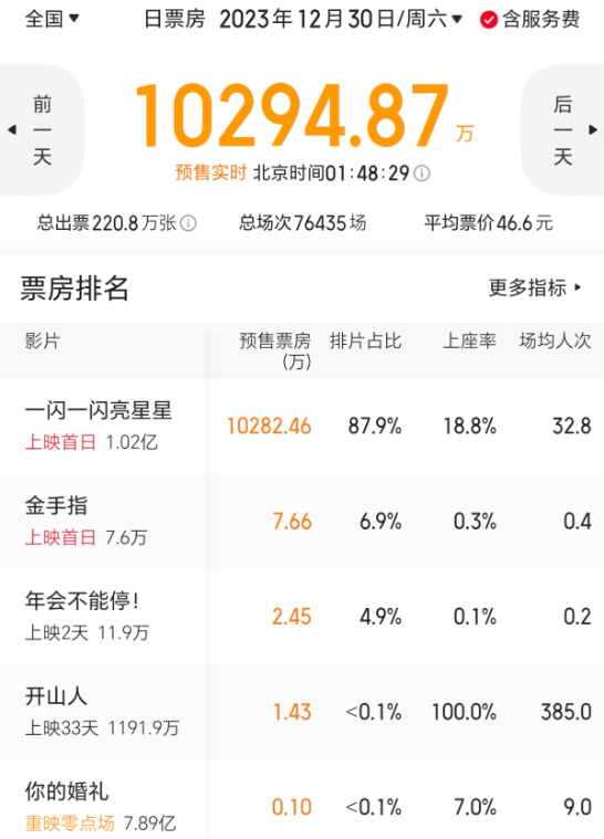 12月5日,距正式上映还有25天,《一闪一闪亮星星》就开启了预售,预售第一天总预售票房突破了7000万元(其中开画当天预售超4500万元),在内地影史仅次于《复仇者联盟4》(预售第一天破亿),超过了《唐人街探案3》(预售第一天近7000万)。