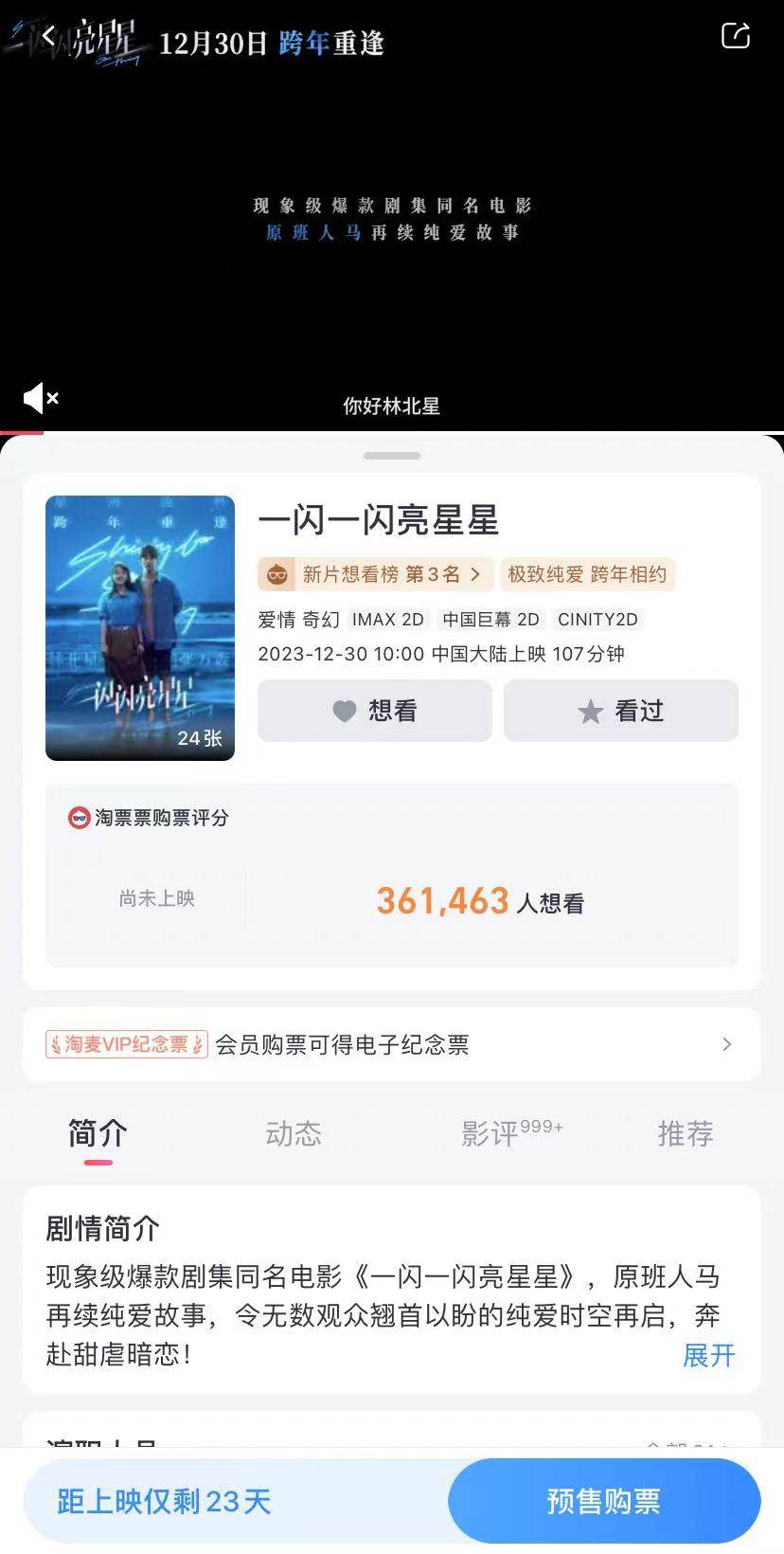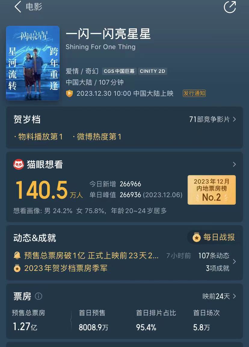 看来这部电影很对年轻观众的胃口,可能很多人都想在电影院和自己的恋人一起跨年,看纯爱电影《一闪一闪亮星星》,距离上映还有23天,票房就破亿了,而且有140多万人观看,有些影院已经被抢购一空,黄牛可能要出动了。
