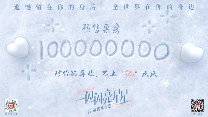 1905电影网讯日前,电影《一闪一闪亮星星》正式开启预售,据专业数据显示,电影《一闪一闪亮星星》映前24天 ,预售总票房破亿,不仅打破中国影史国产片预售首日票房纪录,还成为2024贺岁档预售最快破亿电影,进入贺岁档票房前三位。两位主演屈楚萧、张佳宁同时发文庆祝这一好消息:“谢谢闪光灯们的心‘亿’”。