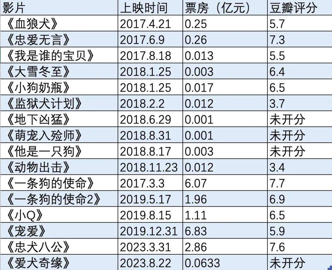 “狗片”很长一段时间以来属于电影市场的边缘题材,票房也集中在百万级别。直到2017年《一条狗的使命》拿下6.07亿的票房后,市场敏锐察觉商机,借着“农历狗年”噱头,仅2018年就有十多部“狗片”登陆内地院线,但其中的大多数口碑票房双失利,爆款难以复制。