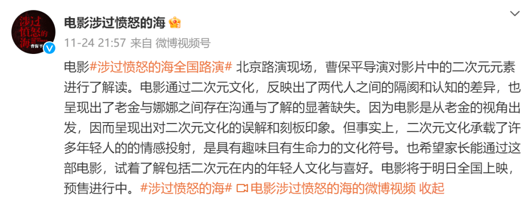 曹保平导演曾在路演中作出了回应,称电影中所呈现的只是从老金的视角出发,对二次元的刻板印象,并非是电影想传达的本意,还呼吁家长试着了解二次元,理解年轻人的喜好。但是有些人依旧不买账,官博下的评论全是质疑的声音。