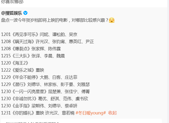 因为还有二十多天,估计还不断有电影要官宣定档贺岁档,所以现在先来看看已经可能进入贺岁档火拼的电影。