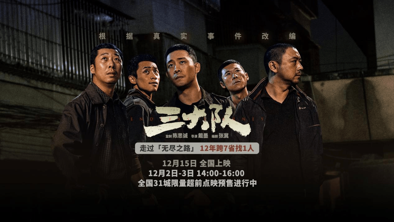 搜狐娱乐讯 即将于12月15日上映的电影《三大队》今日发布“无尽之路”预告。预告中首次披露了三大队在12年间是如何跨越7省,在没支援没配合的情况下,用最原始的方法摸排查案的过程。在预告结尾,程兵终于找到嫌犯,无尽之路终于在第十二个年头迎来了终点。在本周末,电影《三大队》将在31城举办限量超前点映,首次与广大观众见面。电影由陈思诚监制,戴墨导演,张冀编剧,张译领衔主演,李晨特别主演,魏晨、曹炳琨、王骁、张子贤主演,杨新鸣友情出演,31城限量超前点映预售火热进行中。