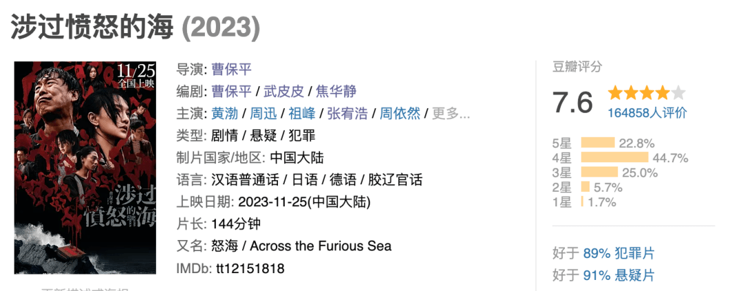 目前,《涉过愤怒的海》豆瓣评分降到7.6。