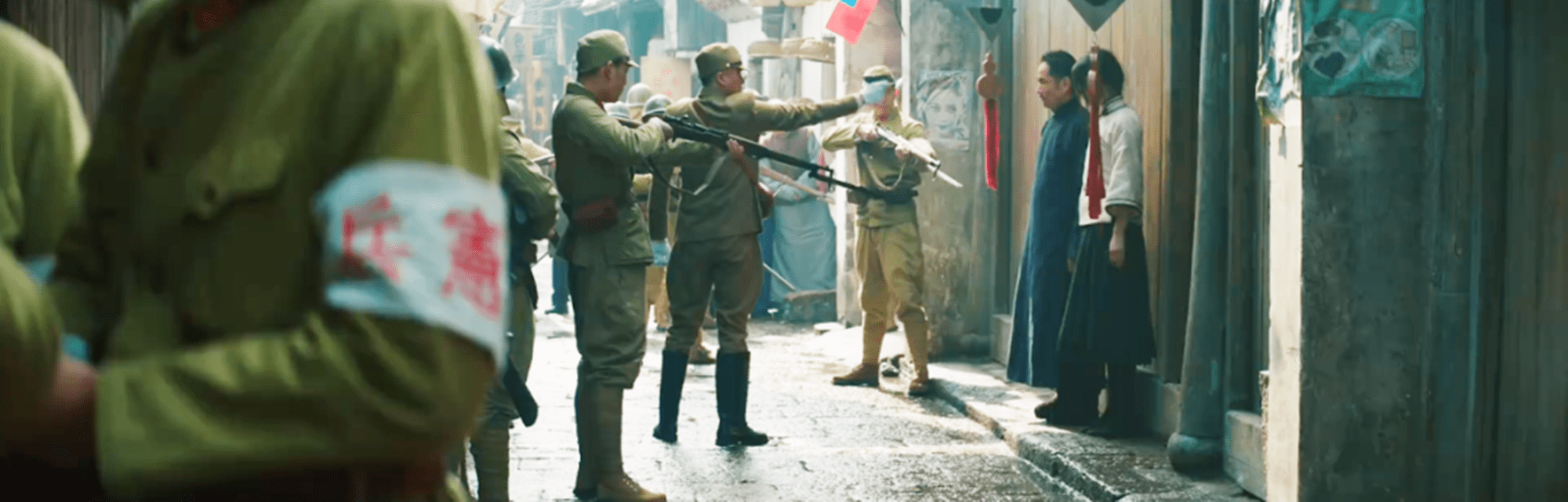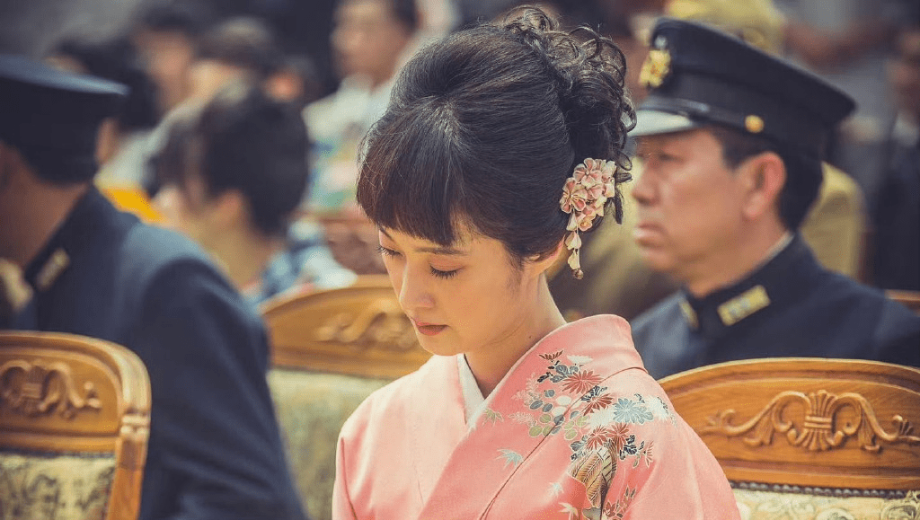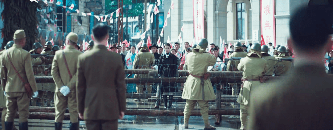 街道两边,是颜色显眼的和服,日军军营上,是大红色的耀眼条幅。