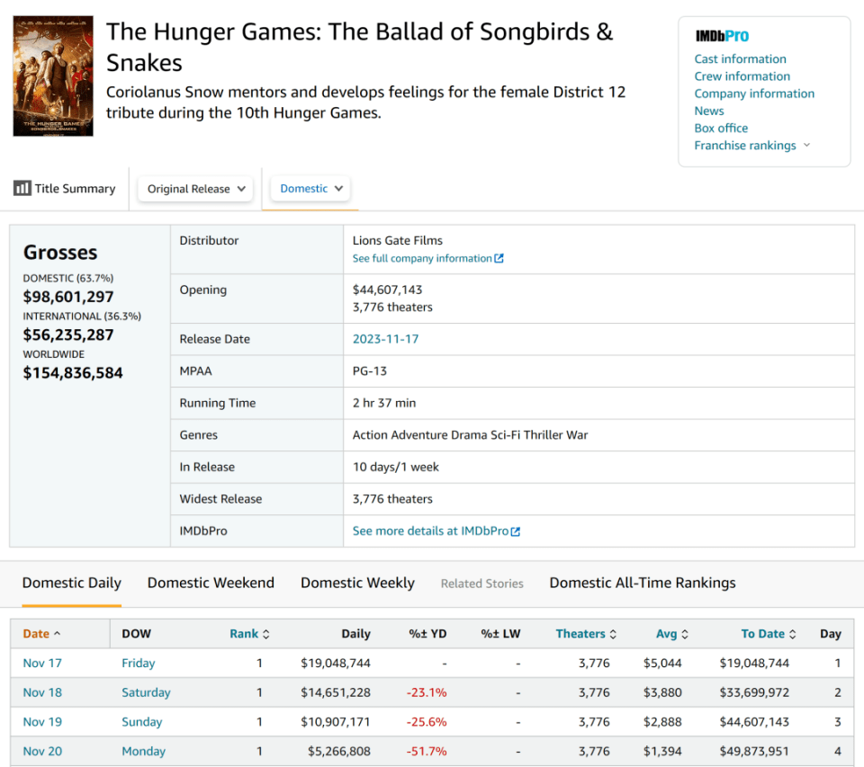 在中国大陆市场,《饥饿游戏:鸣鸟与游蛇之歌》也和许多人预想中的一样表现糟糕,虽然同步上映,但上映12天后,累计票房止步在5000万量级,单日票房位列第十。