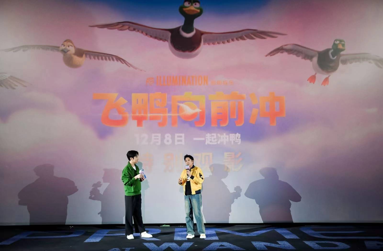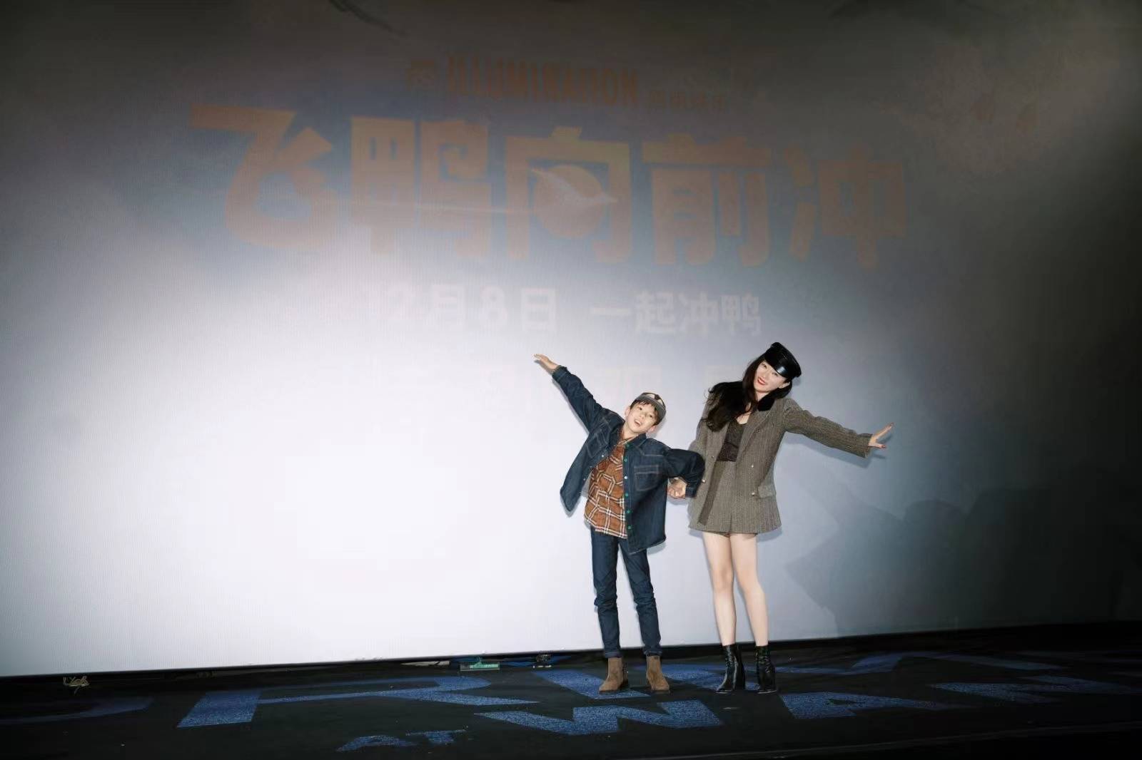 搜狐娱乐讯 (哈麦/文)11月29日,照明娱乐制作,环球影业发行的动画片《飞鸭向前冲》在北京首映,特邀明星欢乐推荐官蔡国庆、霍思燕及她儿子嗯哼出席映后见面会,和观众分享看这部动画电影的感受。