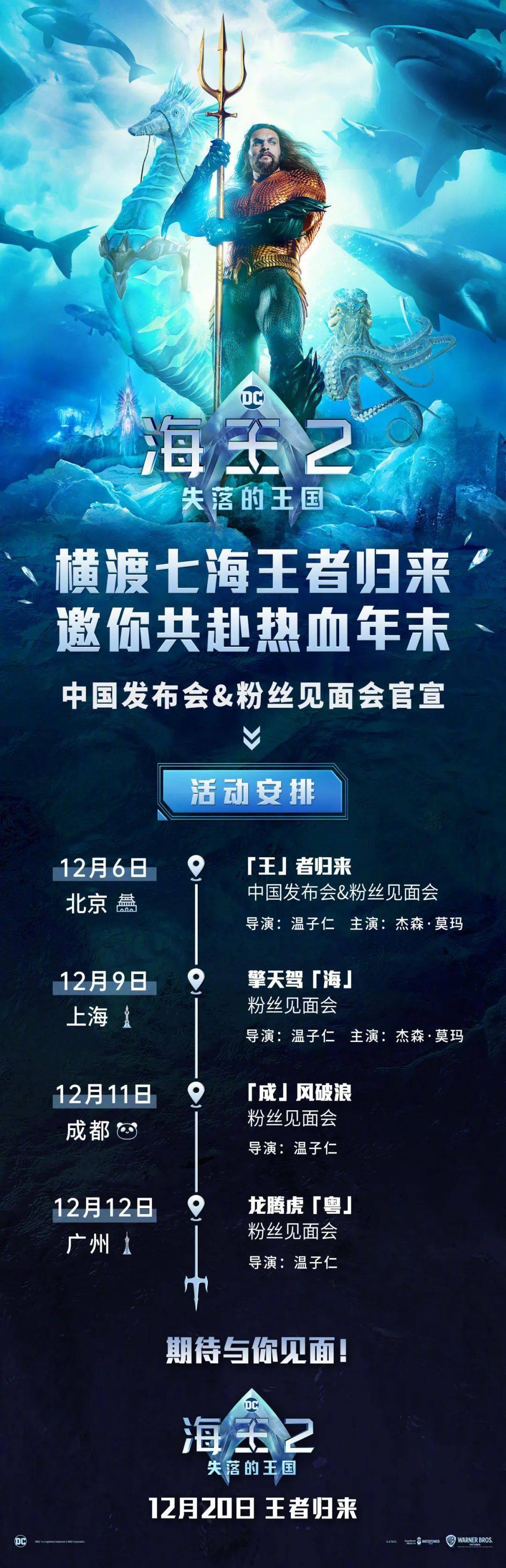 《海王2:失落的王国》宣布主创将开启中国行,主演杰森·莫玛、导演温子仁将来北京、上海、成都、广州,加入中国内地影市的路演大军。影片将于12月20日中国内地上映。