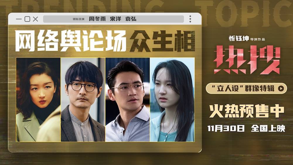 搜狐娱乐讯 由忻钰坤执导,周冬雨、宋洋、袁弘领衔主演的电影《热搜》将于11月30日全国上映。今日,电影发布“立人设”群像特辑,导演忻钰坤坦言“《热搜》剧本中新鲜且有力量的一个设置就是人物”。有瑕疵的施救者、沉默的围观者、无下限的施暴者和不完美的受害者,共同上演了一场“硝烟四起”的网络舆论战。弱者与强权搏命对抗,冷漠麻木的看客在旁围观,这场为真相发声的正义之战会如何展开,令人期待。