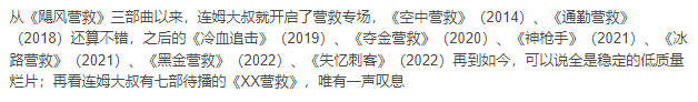 恐怕影片唯一有趣的地方,在于中文译名沿袭了连姆·尼森主演动作片的“营救”套路,这已经成为网络名梗。尼森大叔不出所料,还将继续“营救”下去,直到打不动为止……
