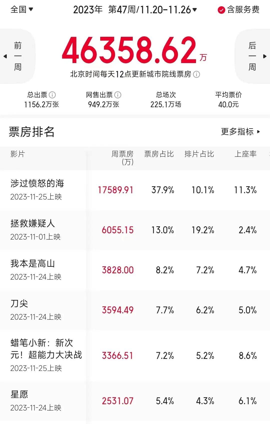 上周影市在《涉过愤怒的海》领衔新片,《我本是高山》《刀尖》《星愿》《蜡笔小新剧场版》分居侧翼的“饱和式供给”下,热度显著回升。据猫眼数据,11.20-11.26一周内地票房报收4.63亿,较前一周的3.20亿大涨44.68%。