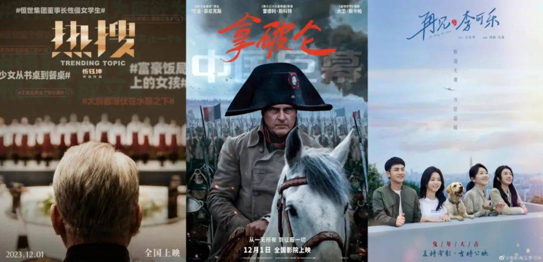 本周院线也算比较热闹,有多部新片上映,但关注度最高的主要是三部:周冬雨、宋洋、袁弘主演的忻钰坤网络题材犯罪新片《热搜》;二是雷德利·斯科特执导,华金·菲尼克斯、凡妮莎·柯比主演的古装史诗巨片《拿破仑》;三是王小列执导,闫妮、谭松韵主演,吴京友情出演的萌宠题材温情家庭片《再见,李可乐》。