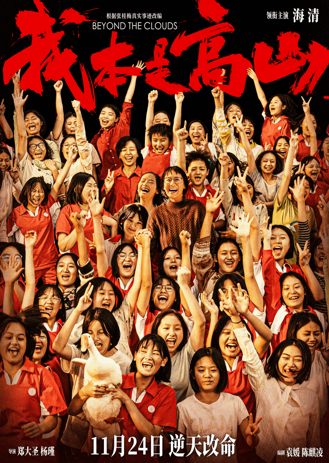 在根据张桂梅真实事迹改编的电影《我本是高山》的一款海报上,几十个学生与张校长(海清 饰)“挤在一起”。她们或振臂高呼,或比着胜利的手势开怀大笑。这是影片剧情结束的瞬间,也是这些山区女孩新人生开始的瞬间。