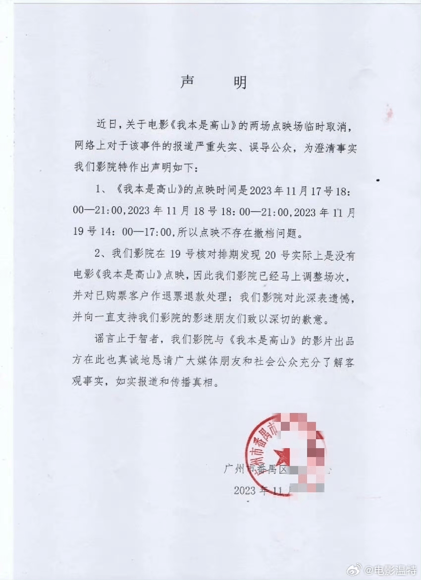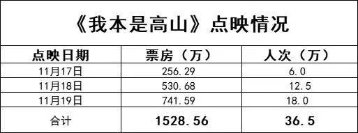 《我本是高山》的点映选在11月17日和18日的18点至21点,以及19日的14点到17点投放至全国24个城市的影院。严格来说,属于中等体量。