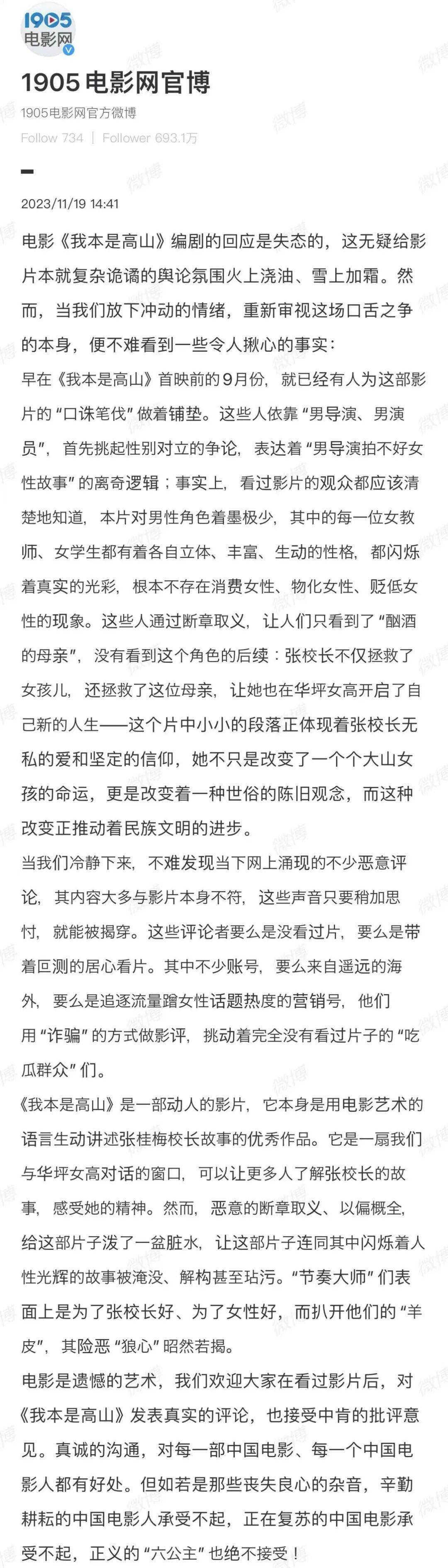 作为较早为《高山》发声的央媒,电影频道在目睹影片争议发酵后迅速发出了一篇长文表态。文中一部分根据影片真实情节一一回应了热点质疑,同时也较为客观地提及编剧的失态回应,以开放的态度希望接受观众的真实、中肯批评意见。