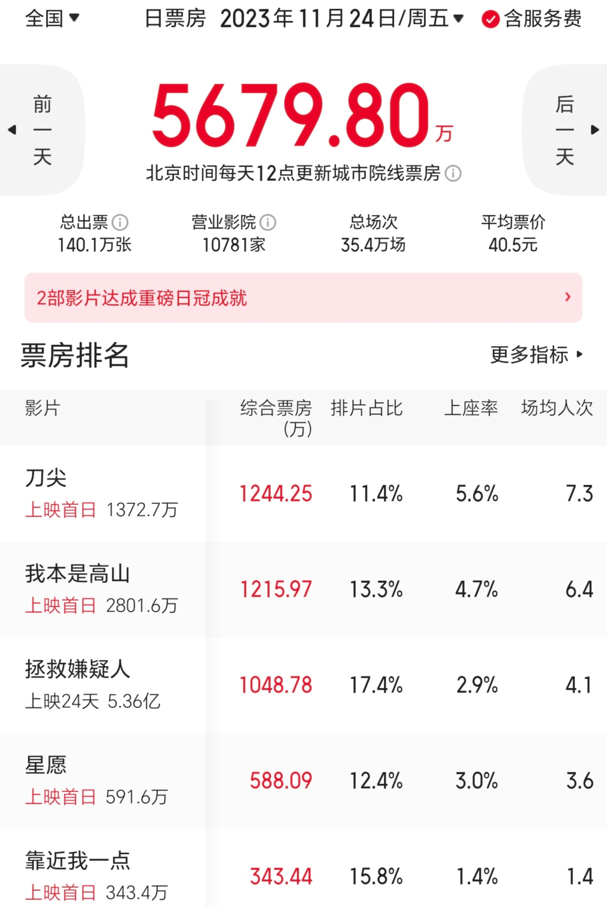 其他四部新片中,《我本是高山》《刀尖》排片提升,《星愿》《靠近我一点》排片大幅下降。