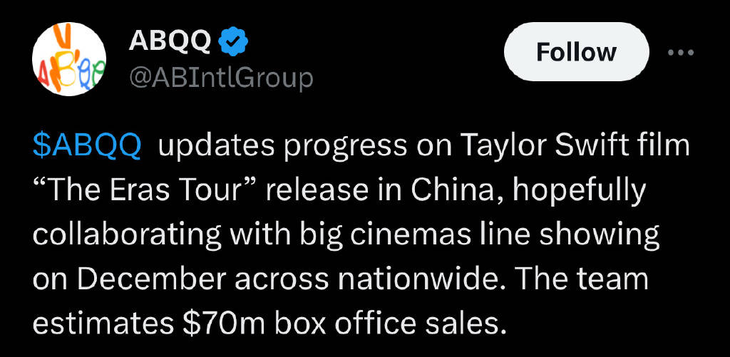搜狐娱乐讯 11月24日,据媒体报道,泰勒AB INTL集团宣布《Taylor Swift: The Eras Tour》将在中国内地上映!此外ABQQ也透露电影将在中国与大型院线合作,预估票房7000万美元。