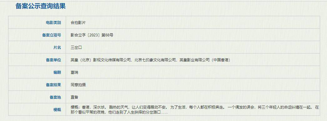 1905电影网讯近日,国家电影局发布关于2023年10月上全国电影剧本(梗概)备案、立项公示的通知,葛瑞担任编剧的电影《三岔口》立项,备案单位为英皇(北京)影视文化传媒有限公司、北京七印象文化有限公司、英皇影业有限公司(中国香港)。