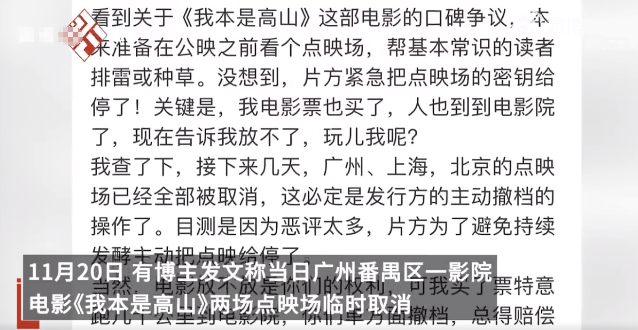 搜狐娱乐讯 11月21日,有网友发文称当日广州番禺区一影院电影《我本是高山》两场点映临时取消。网友表示片方紧急将点映场的密钥停了,还发现接下来几天,广州、上海,北京的点映场已经全部被取消,“我买了票特意跑几十公里到电影院,你们单方面撤档,总得赔偿”。