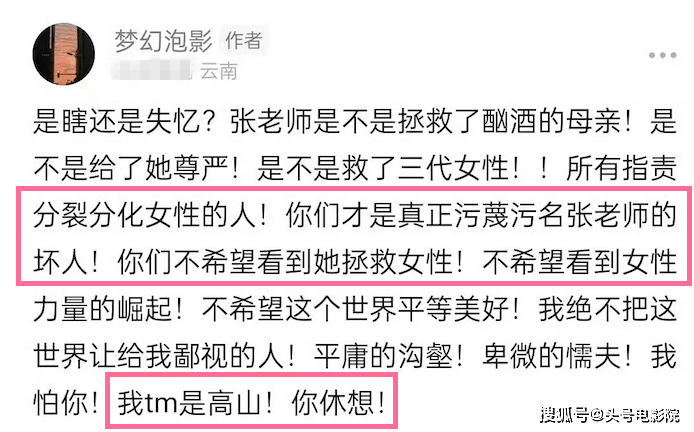 她认为“电影遭遇舆情”,还回怼了网友,称“指责分裂分化女性的人!你们才是真正污蔑污名张老师的坏人!”